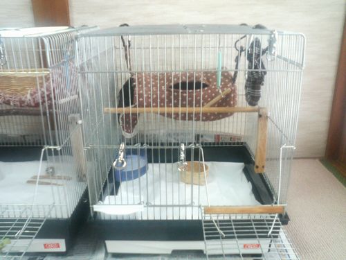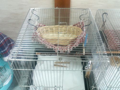 冬の寒さ対策で、まりも宅のようなトンネル(ティッシュケース)を入れようかと考えたが大きさ的に無理なので、平たいカゴをハンモックのような状態で吊るしている。