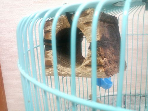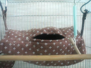 さざなみインコは暗い所が好きだと何かで読んだので、ティッシュケース(100円)をぶら下げている。